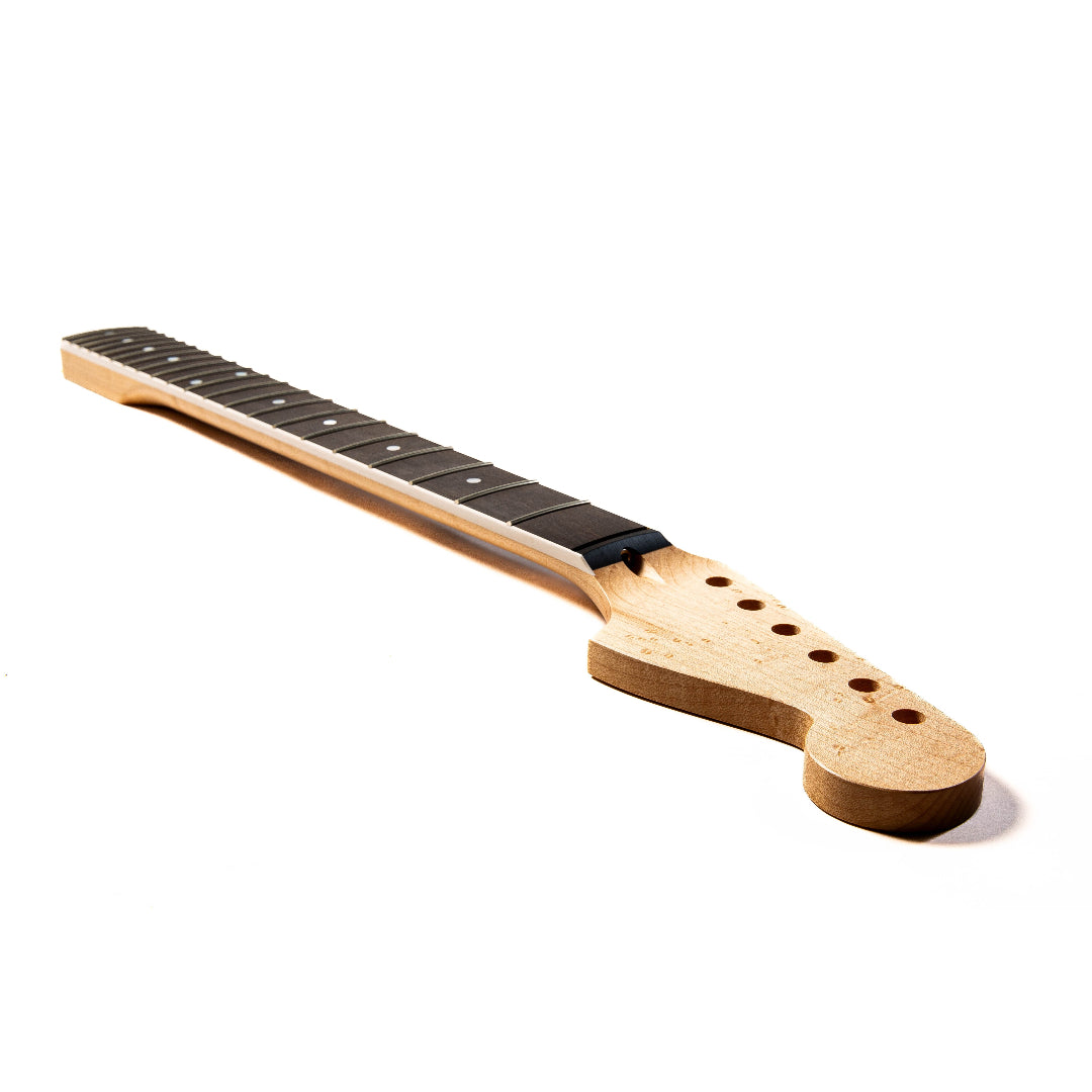 Birds Eye Maple refers to a unique and distinctive figuring that appears as small to medium-sized "eyes" or knots within the wood grain. This pattern is not indicative of a separate species of maple, but rather a natural abnormality, believed to be the result of dormant bud growth. The Allparts Select Exotic Birds Eye series replacement guitar necks showcase this striking wood, paired with an A-grade African Ebony fretboard. This combination not only enhances the bright tonal qualities of maple but also delivers a visually stunning contrast for an elegant, high-end aesthetic.