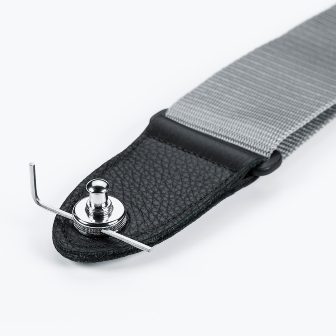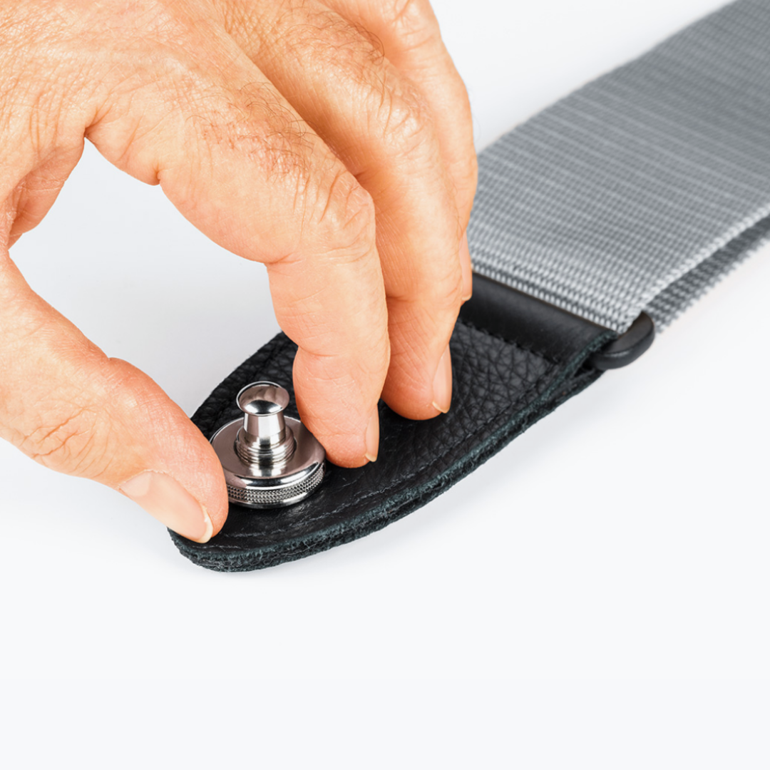New and unique solid one-piece strap button in hardened steel with self-tapping wood thread. Simply screw it on with an Allen key (size 3mm/ 1/8").