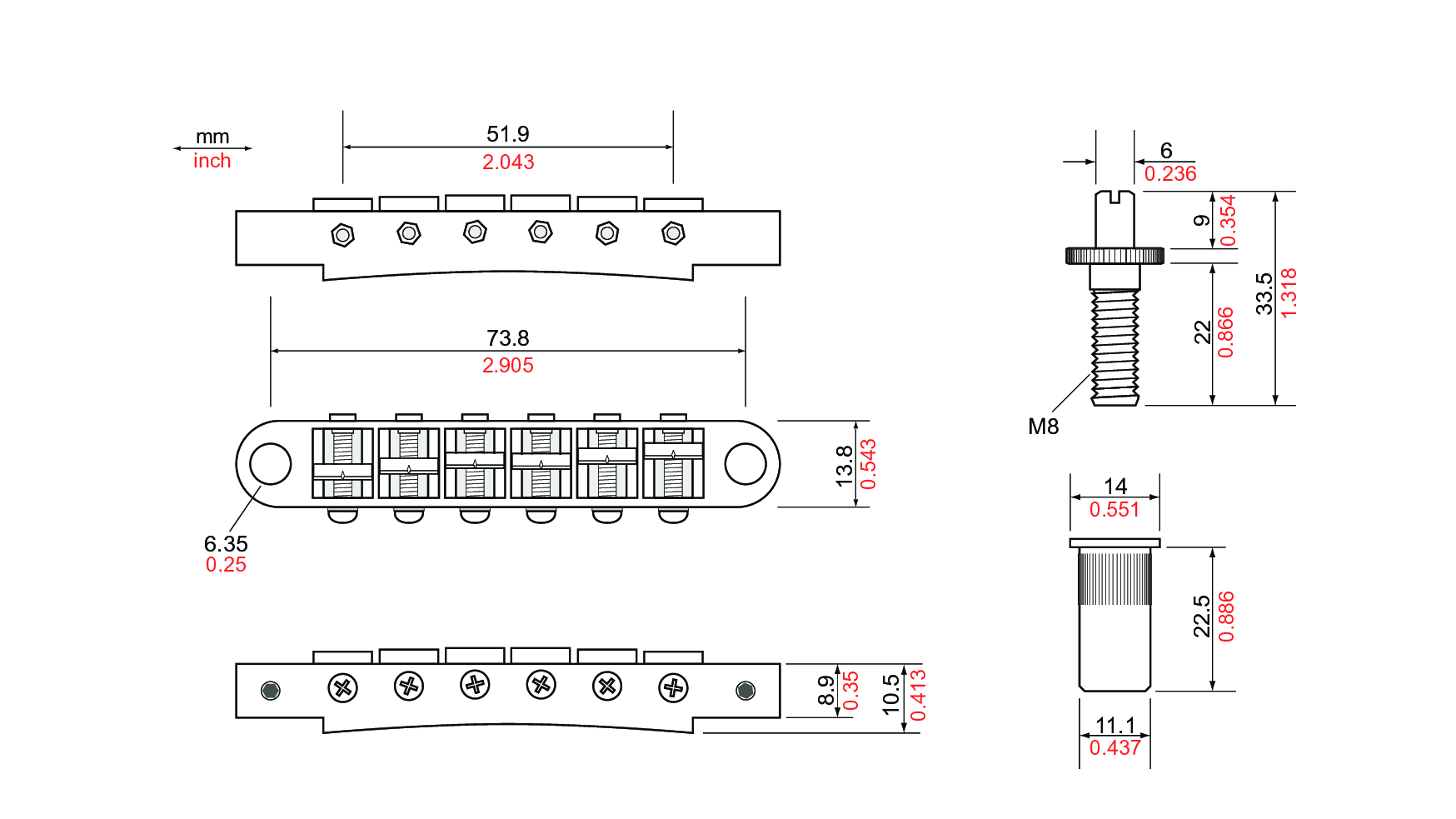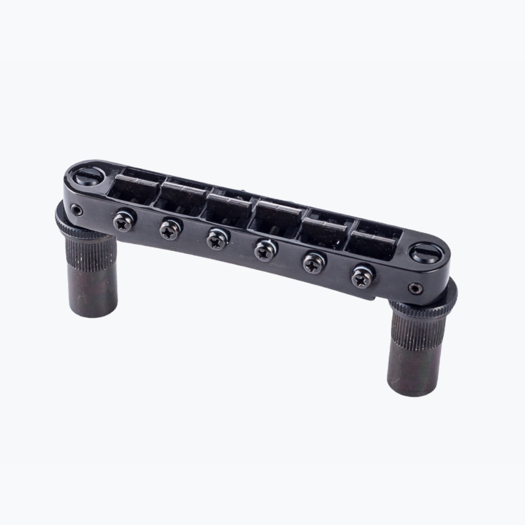 The TonePros T3BT is a locking Nashville style bridge with “easy to use” features like intonation adjustment on the pickup side, phillips head saddle adjustment screws, and pre-notched saddles, large posts, and metric thread. This model fits most guitars made overseas.