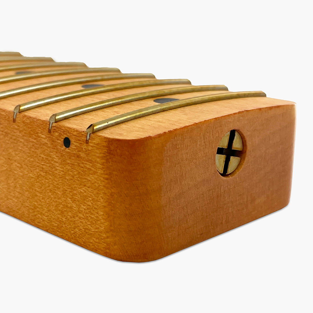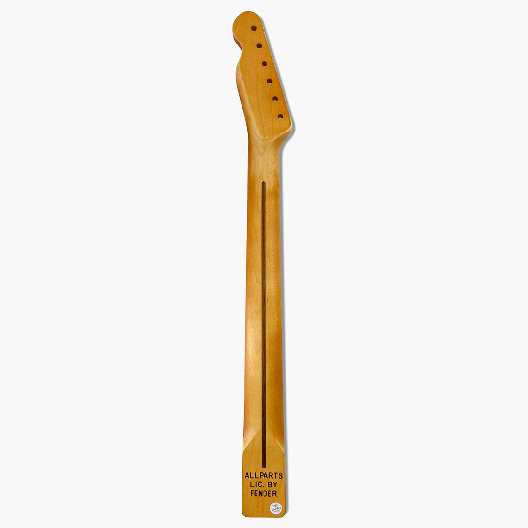 Our TMVF-C replacement neck for Telecaster® is “officially licensed by Fender®” and made to exacting quality standards in Japan. With its C-shape profile, your hand will glide effortlessly up and down the neck. Wilder string bending and fast playing are at your fingertips with its flatter 10" radiused fretboard! Finished with an "aged satin" poly-finish, your guitar will have the broken-in look and feel of a well-played instrument. Wear patterns for each neck are done by hand, so no two necks are the same!