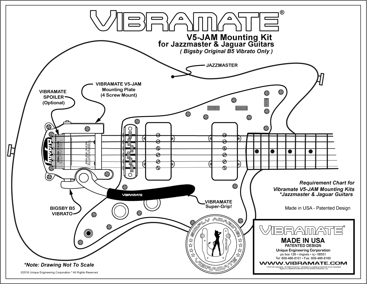 Now you can install a Bigsby B5 Vibrato on your Jazz Master or Jaguar guitar without drilling any holes! The Vibramate V5-JAM Model Mounting Kit is designed for a Bigsby B5 Original Vibrato and will fit most Standard Jazz Master or Jaguar guitars with Stock Vibrato Bridge. Part number TP-3748-005.