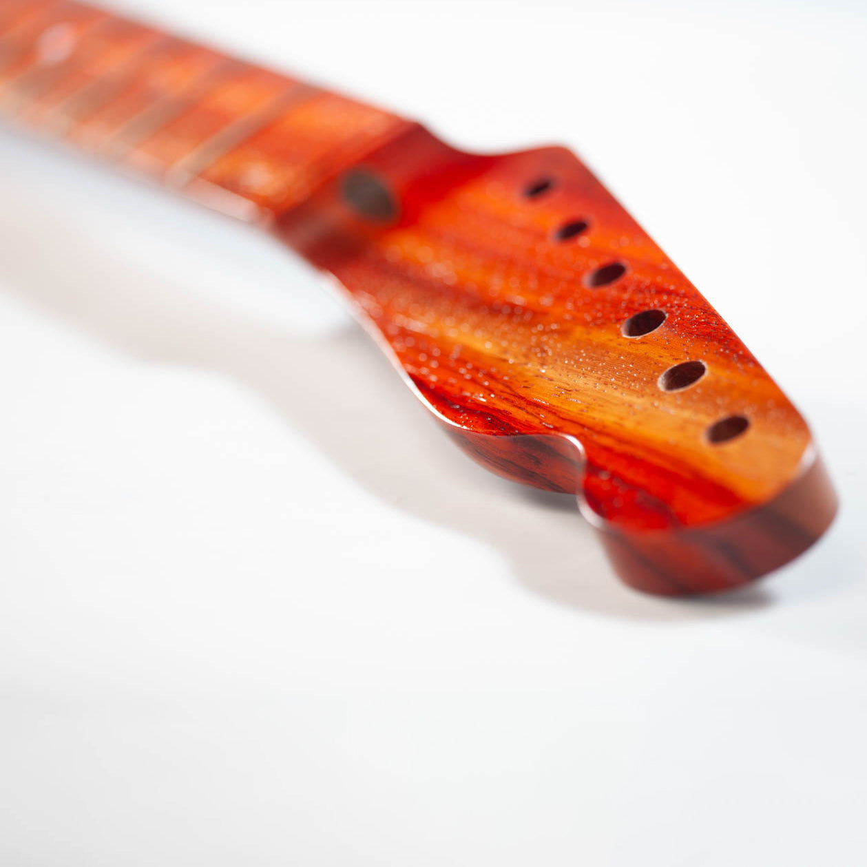 Padauk Bariolé refers to a visually striking variation of Padauk wood, characterized by its bariolé (variegated) appearance, featuring vivid streaks of red, orange, brown, and occasionally purple. Tonally, it is comparable to maple in brightness but offers greater harmonic richness and midrange complexity. Its higher density also enhances structural integrity, providing improved neck stability and resistance to seasonal changes and warping. As a result, Padauk has gained popularity among luthiers as a distinctive and reliable tone wood choice.