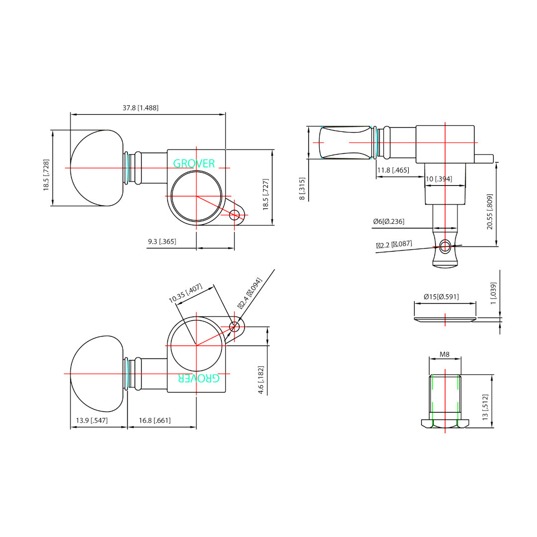 Totally professional in design and performance. Small, lightweight, this precision made machine fits guitar headpieces that will not take full size machines. The mini buttons provide more space for player’s fingers (even large fingers) to tune strings. Gear ratio is 14 to 1. Sealed in lubrication keeps the mini perfect for a lifetime! Includes 5/8″ washers, bushings and wood screws. Allparts #TK-7906.