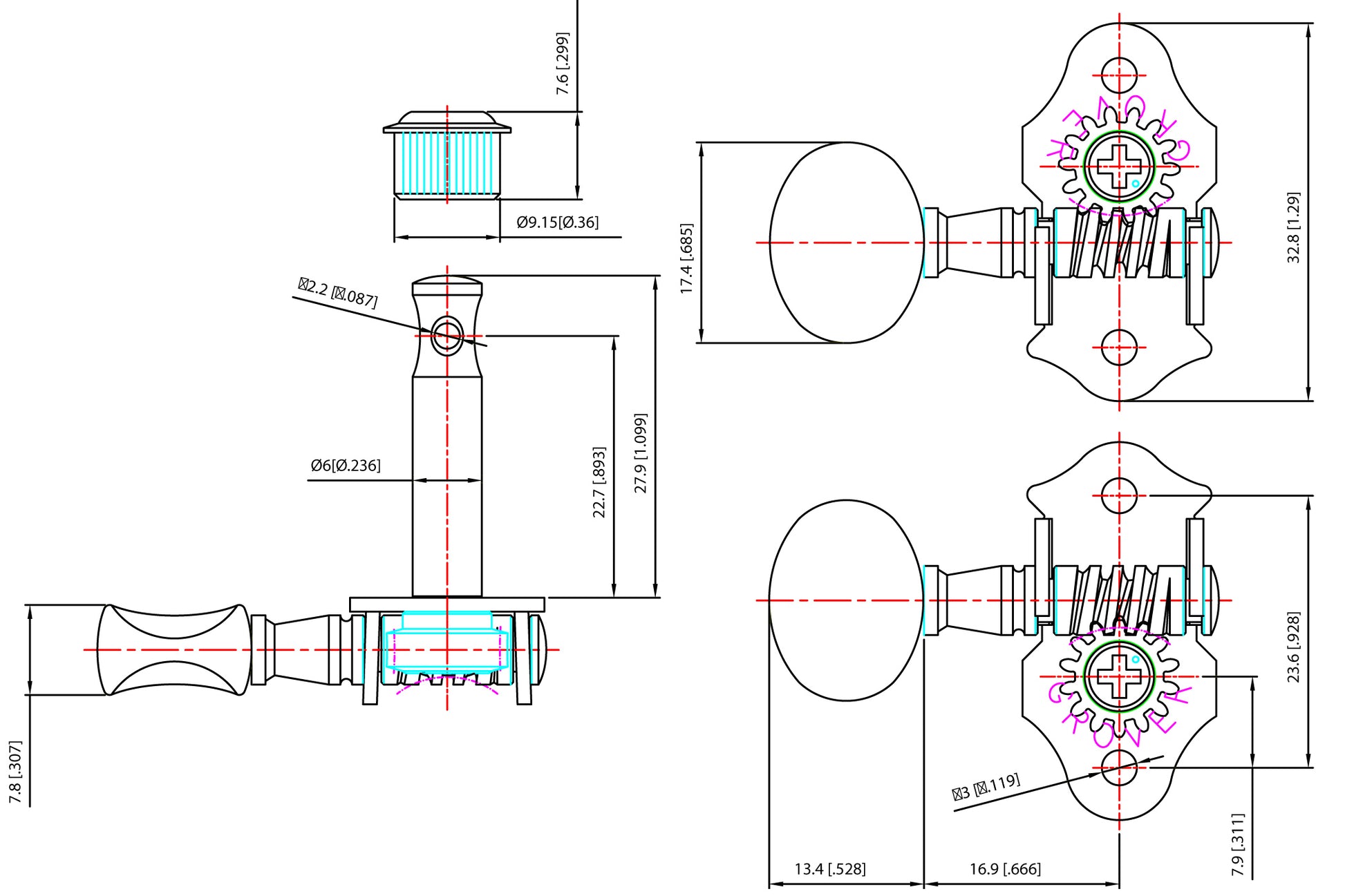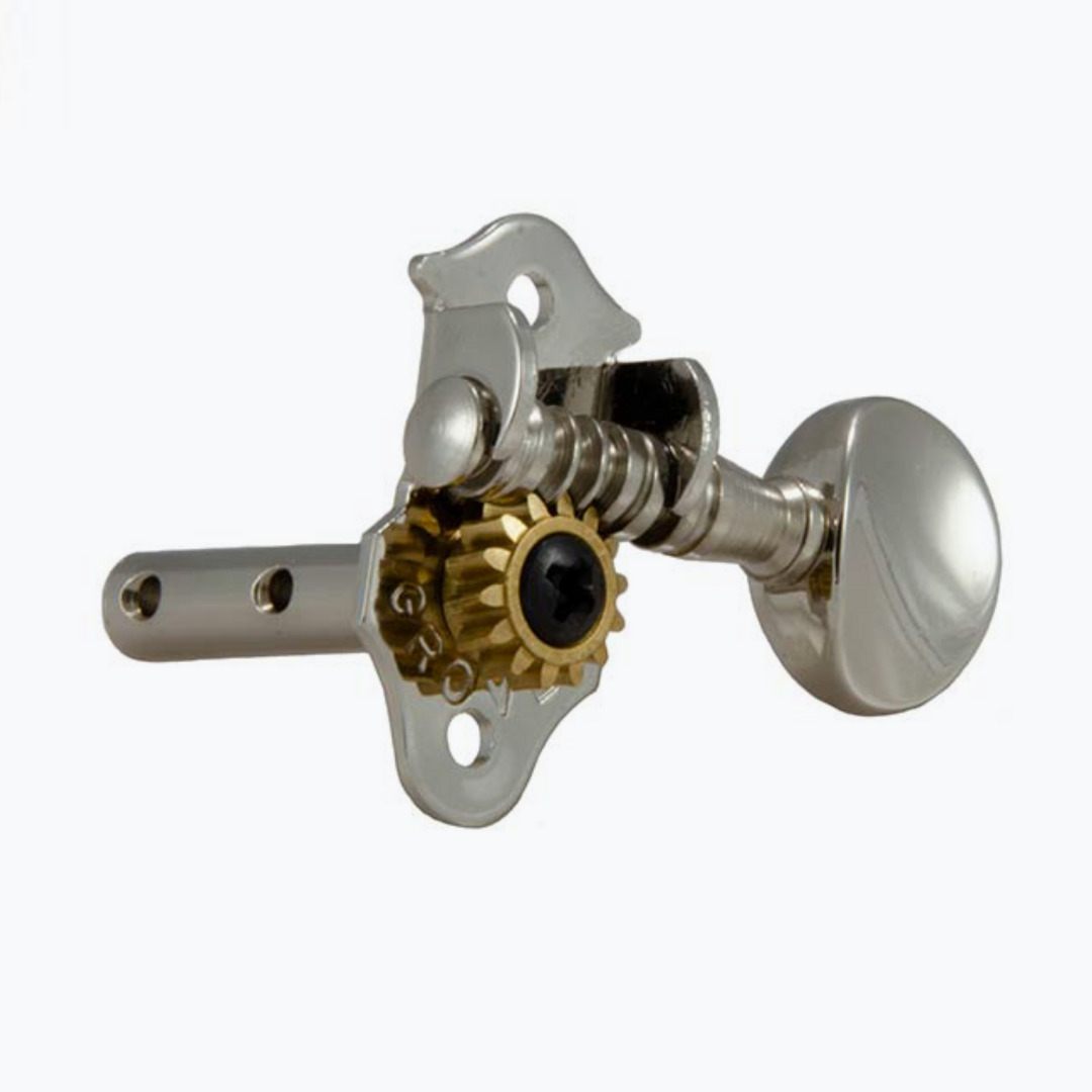 Beautiful machine heads with the classic round button, the 98 Series provides smooth, sure tuning. Heavily plated finish with a striking contrast to the brass gears. Screws and bushing included. 14:1 gear ratio.