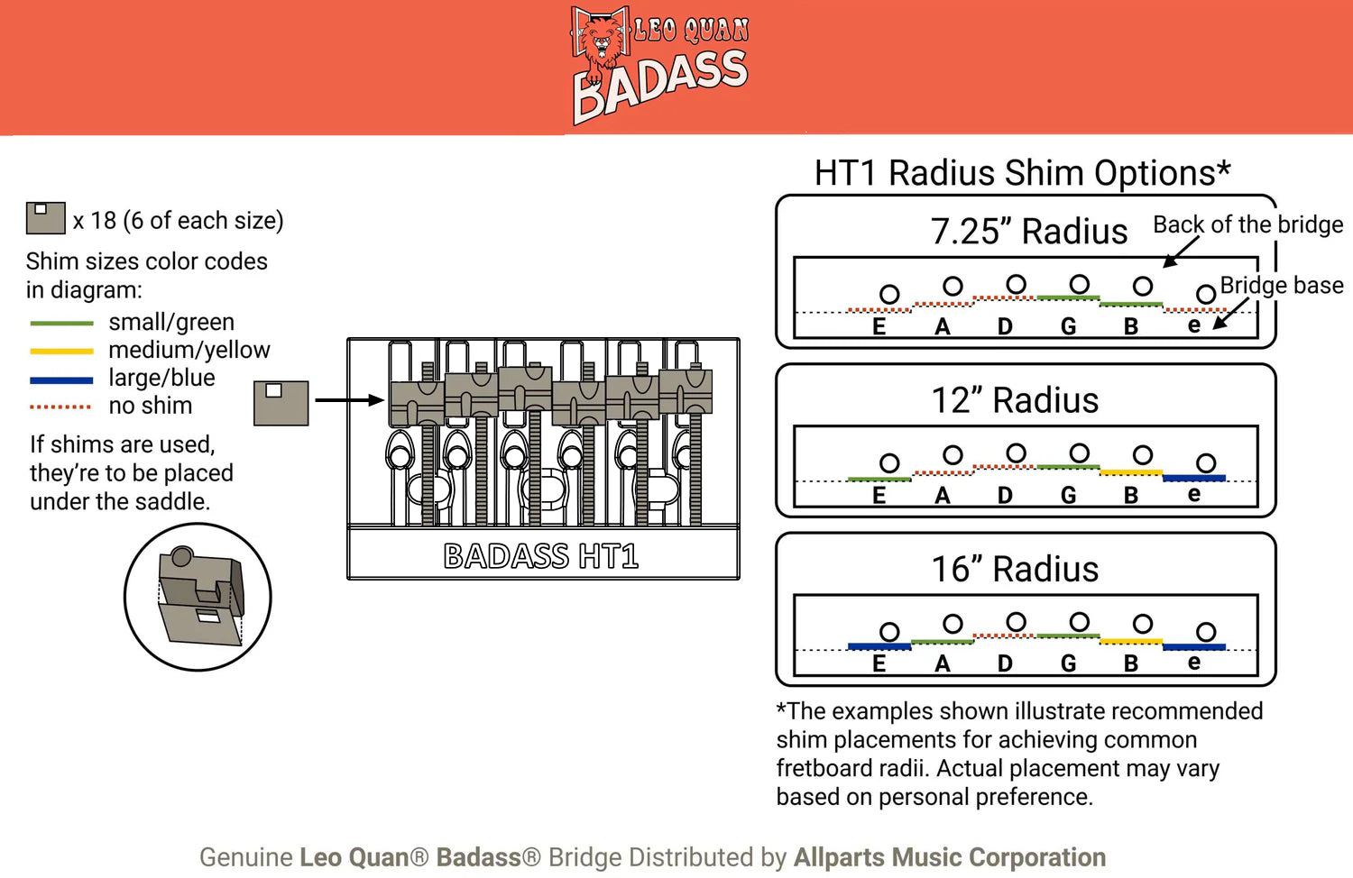 - While the strings are off, choose the guide that best matches your guitar's fretboard radius and install the shim underneath the saddle in the positions shown illustrated. Once the shims are in place, install your strings and tune to pitch as usual.
